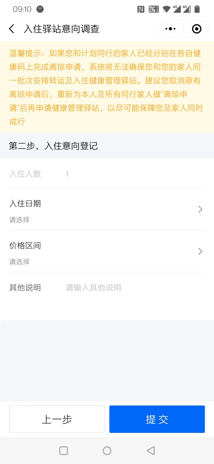 第三步:选择共同入住健康驿站的人员后,进入“入住意向登记”环节,可选择入住时间、酒店价格区间及其他说明,注意此环节的信息填写,将作为相关部门安排酒店的参考意见,请您根据实际情况选择。