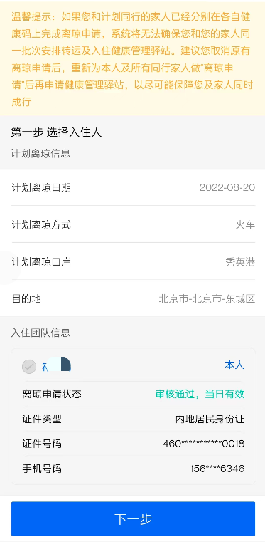 第二步:点击发起后填写健康驿站意向后,进入“选择入住人”环节,页面显示此前完成的“离琼申请”信息、个人及代申请人的信息,在这一环节,可选择共同入住健康驿站的人员。