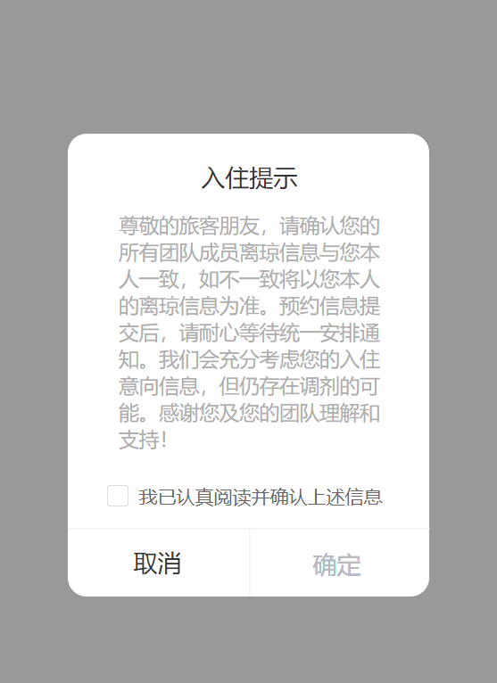 第四步:填写入住意向后,进入入住提示环节,填写人需仔细阅读并承诺勾选“我已认真阅读并确认上述信息”,点击确定后即完成提交。可在申请列表中查看审核详情。