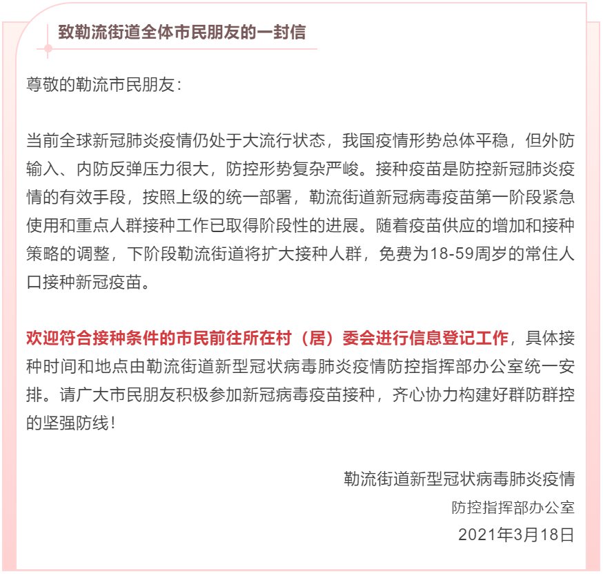 随着疫苗供应的增加和接种策略的调整,勒流街道下阶段将扩大接种人群,免费为18-59周岁的常住人口接种新冠疫苗。