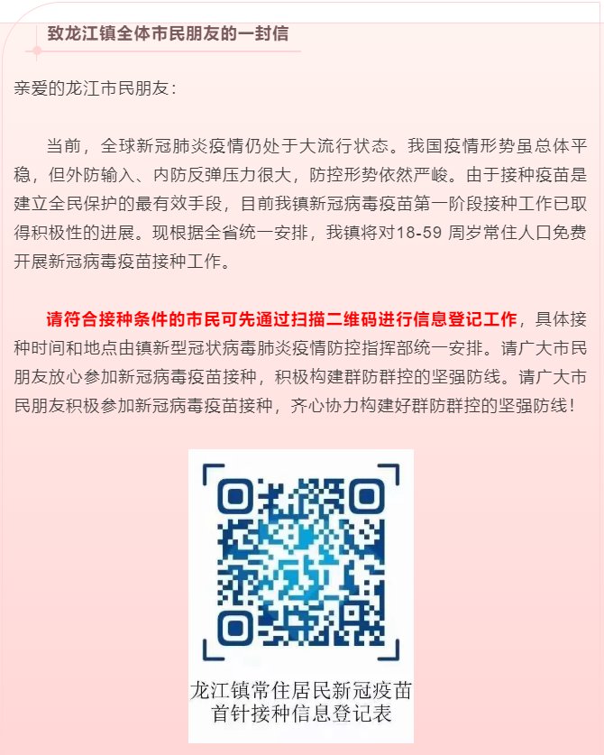 请符合接种条件的市民可先通过扫描二维码进行信息登记工作,具体接种时间和地点由镇新型冠状病毒肺炎疫情防控指挥部统一安排。