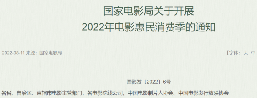 为促进电影消费,加快电影市场恢复,国家电影局近日发布通知,明确开展2022年电影惠民消费季有关事项。