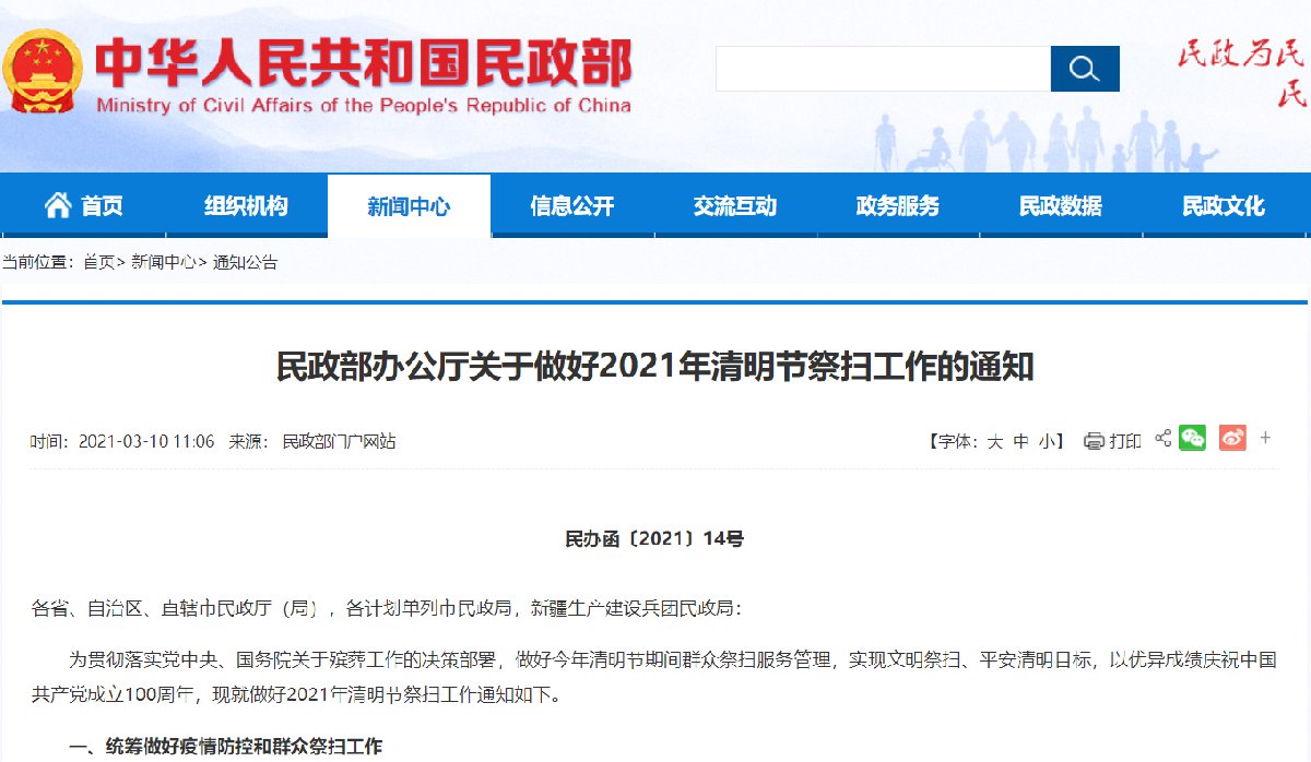民政部办公厅关于做好2021年清明节祭扫工作的通知