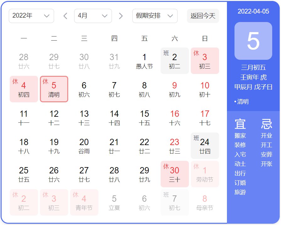 清明节:2022年4月3日至5日放假调休,共3天。4月2日(星期六)上班。