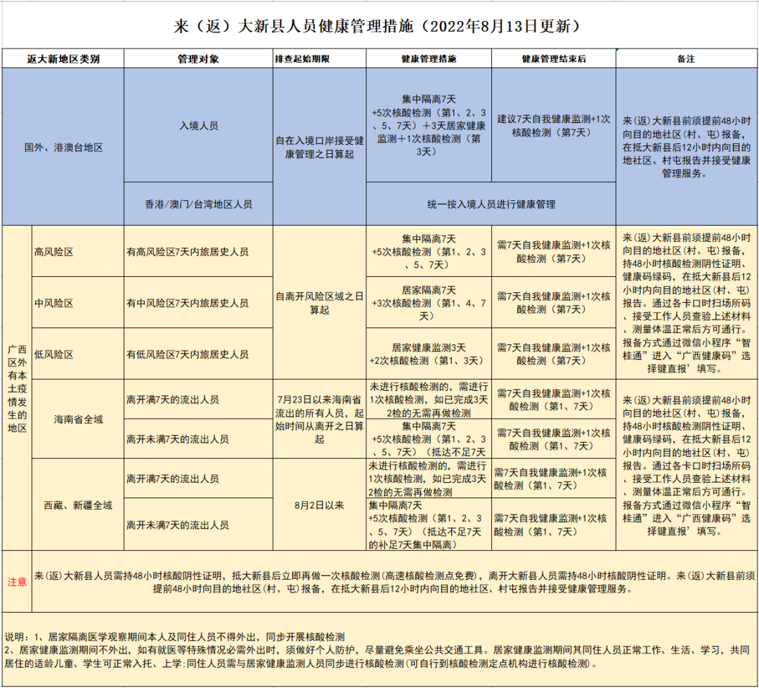 来(返)大新县前须提前48小时向目的地社区(村、屯)报备,在抵大新县后12小时内向目的地社区、村屯报告并接受健康管理服务。