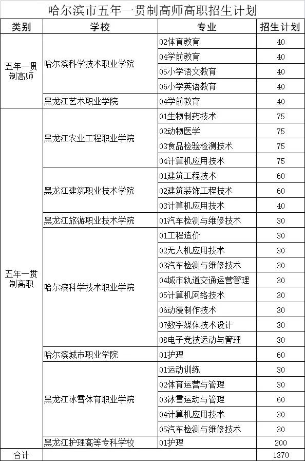 2022哈尔滨市五年一贯制高师高职招生计划表