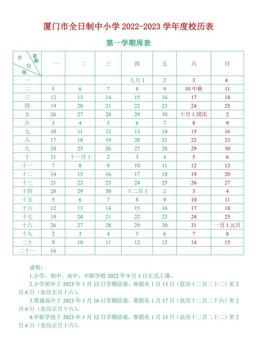 厦门市全日制中小学2022-2023学年度校历表