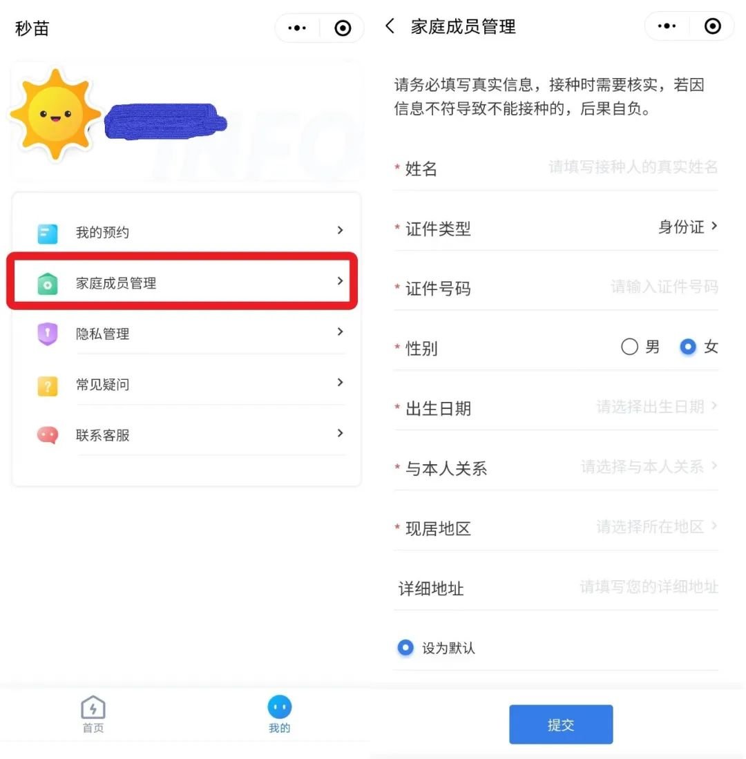 3、提前完善个人信息:点击【我的—家庭成员管理】填写个人信息(已填写过的用户可忽略此步骤);等待抢苗时间;