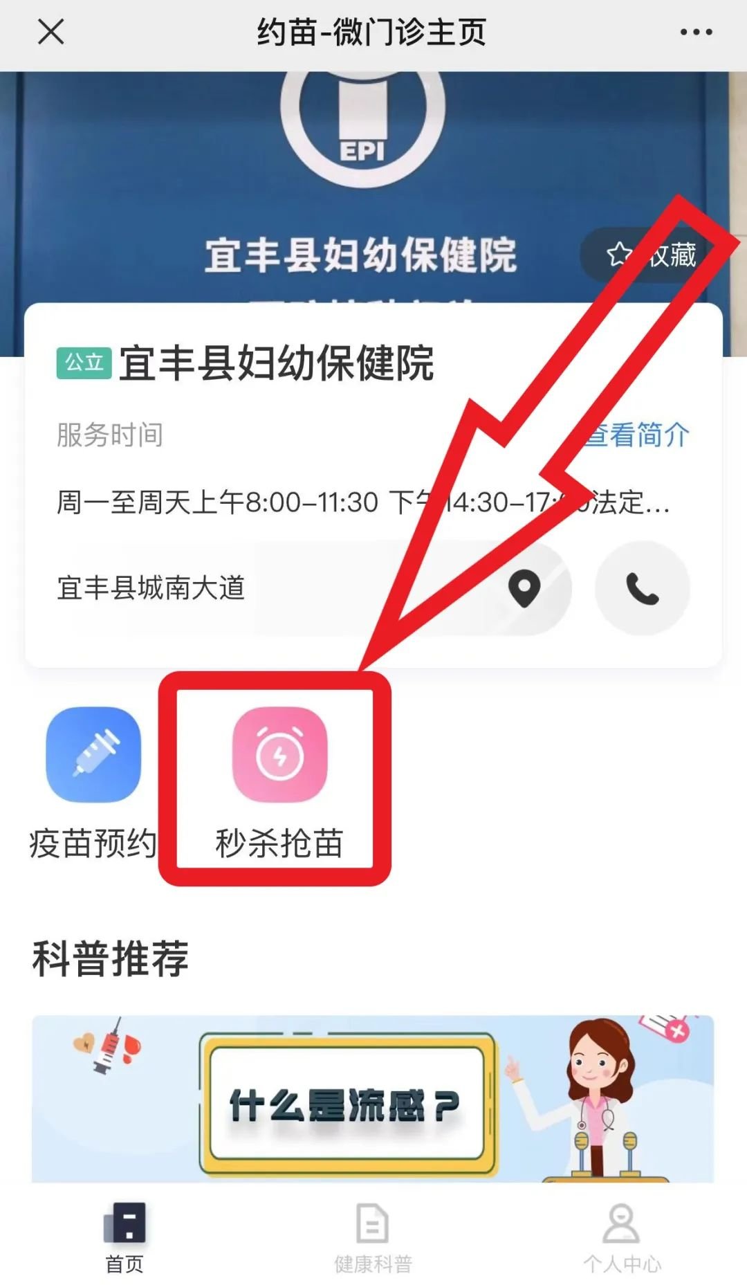 1、点击进入微门诊,点击【秒杀抢苗】;