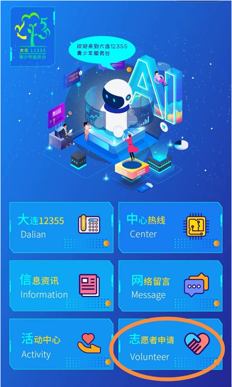 2、进入“大连12355”微信小程序后,点击“志愿者申请”选项,直接填报。
