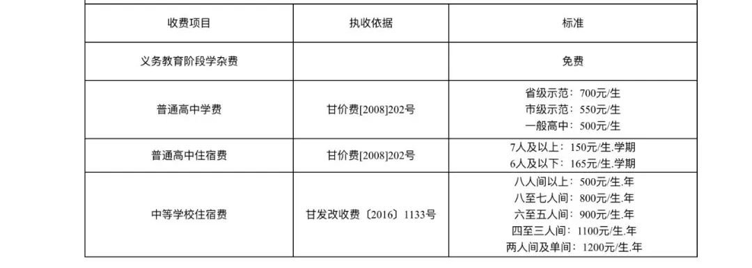 今年秋季学期甘肃省中小学收费标准分别为: