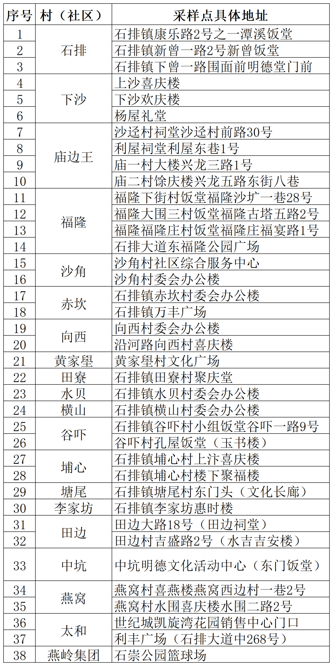 全镇以村(社区)为单位,设立38个核酸采样点(详见下面附表),请选择就近临时采样点采样。