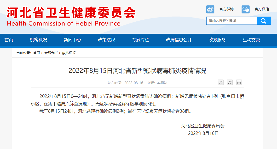 截至8月15日24时,河北省现有确诊病例2例;尚在医学观察无症状感染者38例。