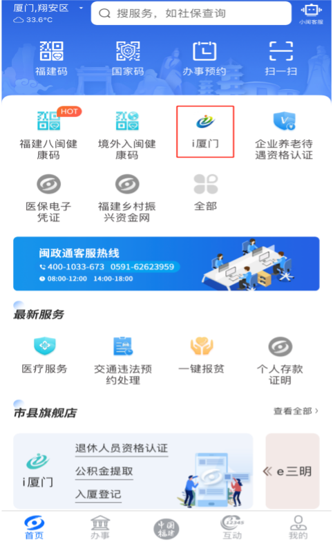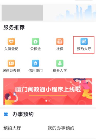 4.登录“闽政通”APP,点击首页中“i厦门”,选择“办事预约”—“预约大厅”进行预约。