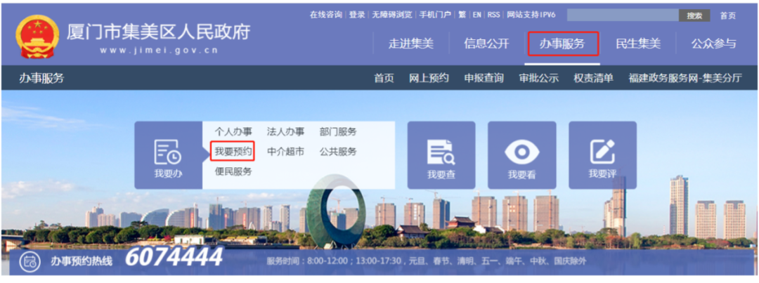 1.登录厦门市集美区政府官方网站(http://www.jimei.gov.cn/)选择“办事服务”栏目中的“我要预约”进行预约;