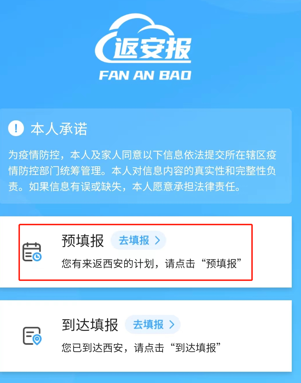 1、抵达西安前进入“返安报”小程序,点击预填报;