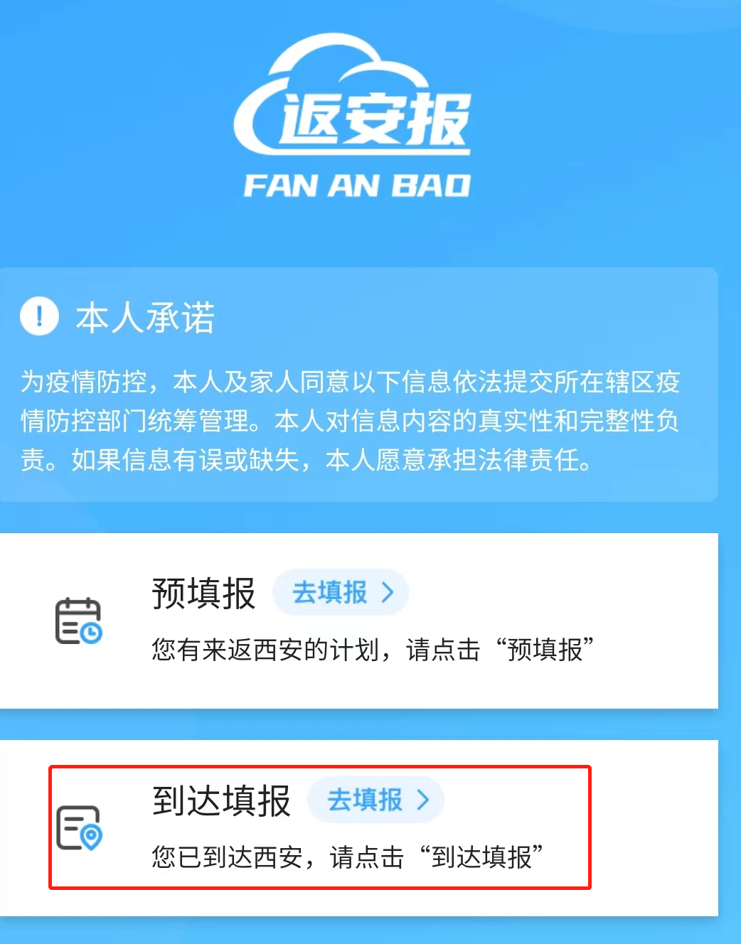 3、抵达西安时再次进入“返安报”小程序点击到达填报;