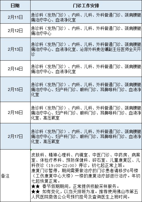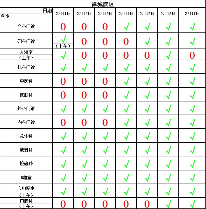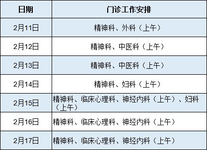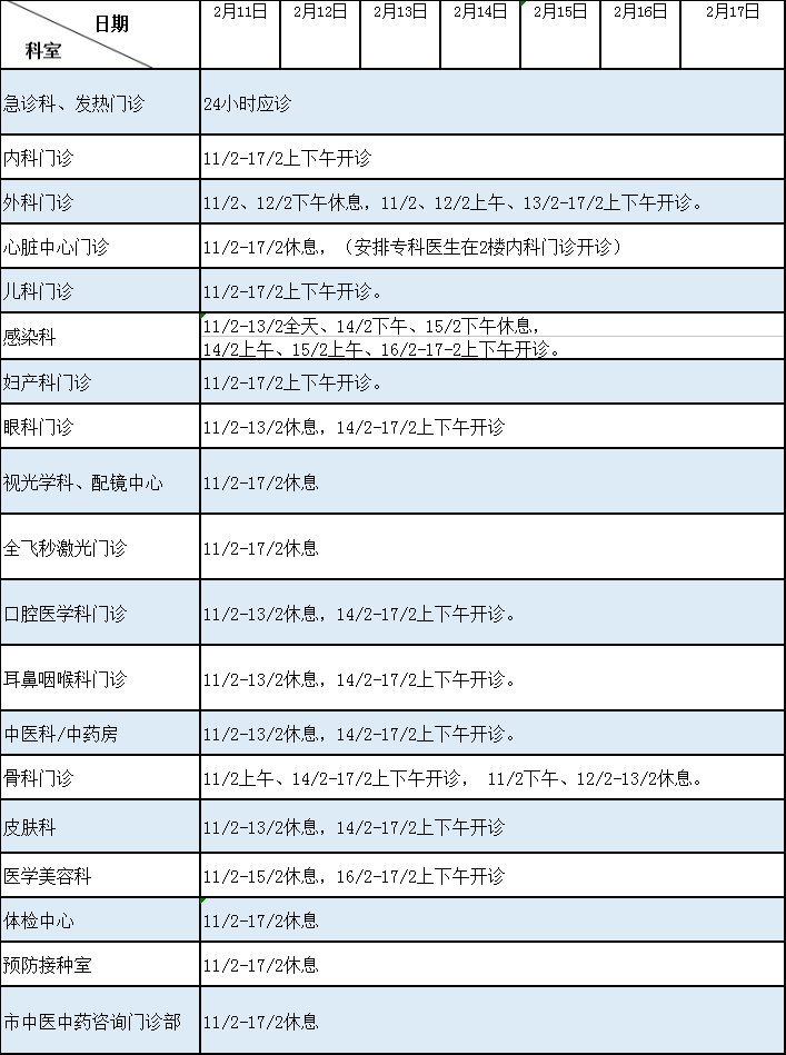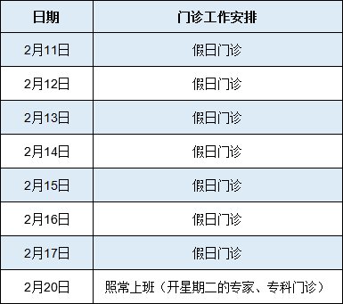 河滨路总院及城南门诊部、同济西门诊部在2月11日至2月17日放假(共7天),2月20日(星期六)安排补班。