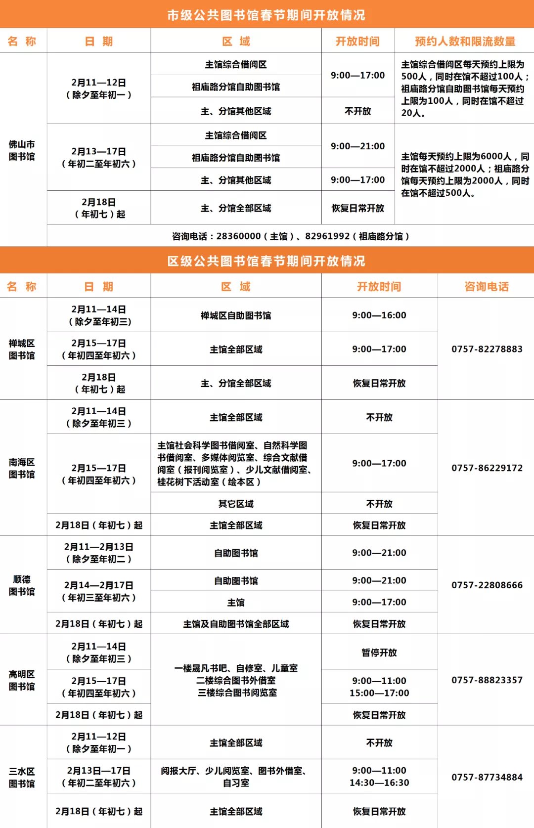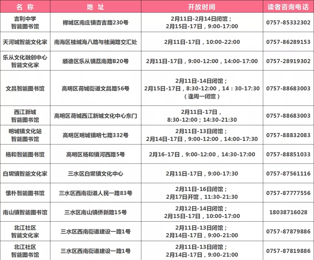咨询电话:0757-28360000(主馆)、82961992(祖庙路分馆)。
