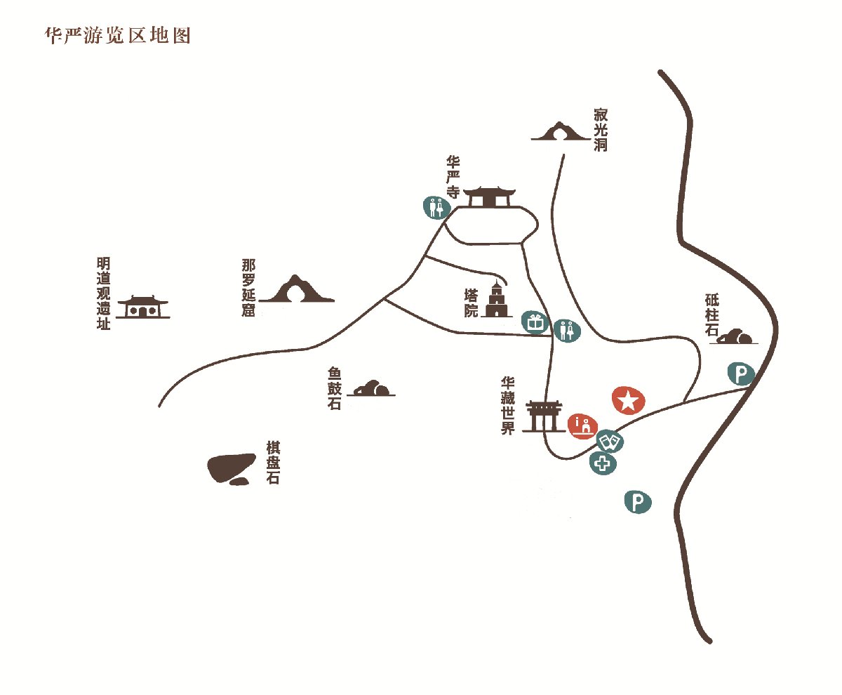 如图,华藏门---莲花路---塔院---华严寺---鱼鼓石---那罗延窟,全程游览时间大约2个小时。