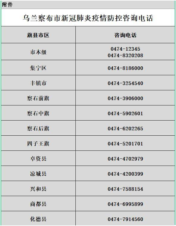 附件:乌兰察布市新冠肺炎疫情防控咨询电话