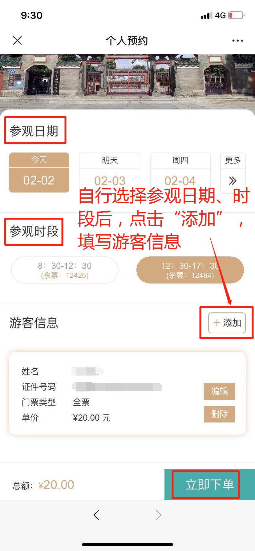 4、请自行选择参观日期、参观时段,点击“添加”,选择人员所属票类,并填写姓名、证件类型(支持身份证、护照、港澳通行证购票)、身份证号等游客信息,即可点击“立即下单”进行购票;