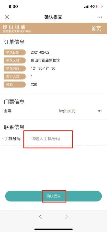 5、确认订单信息无误后,输入手机号码,点击“确认提交”;