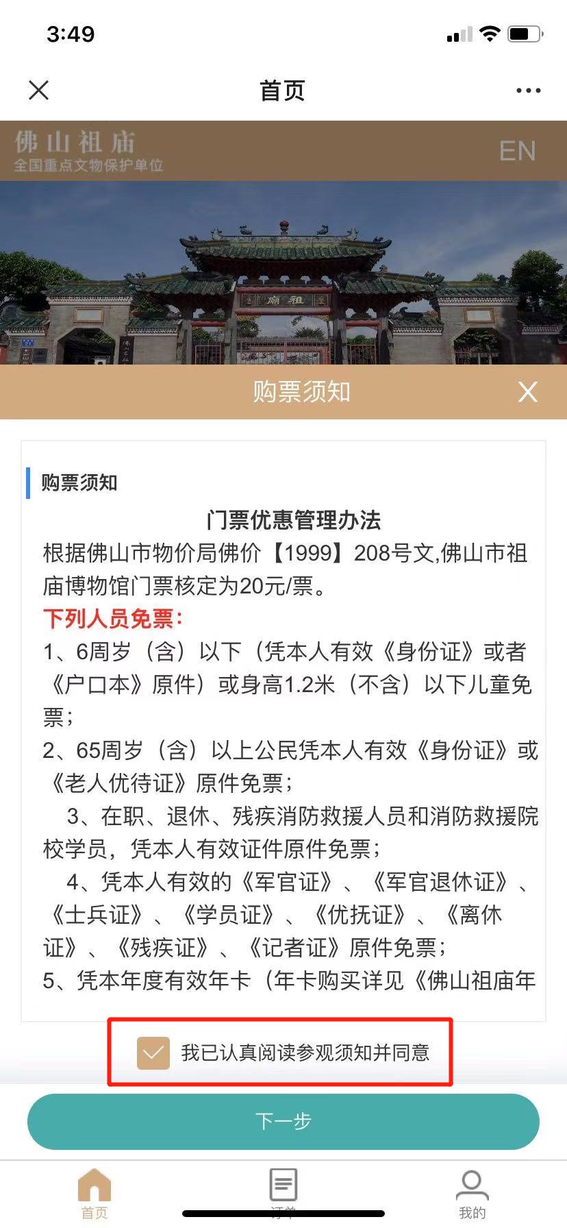 3、阅览购票须知,勾选“我已认真阅读参观须知并同意”。