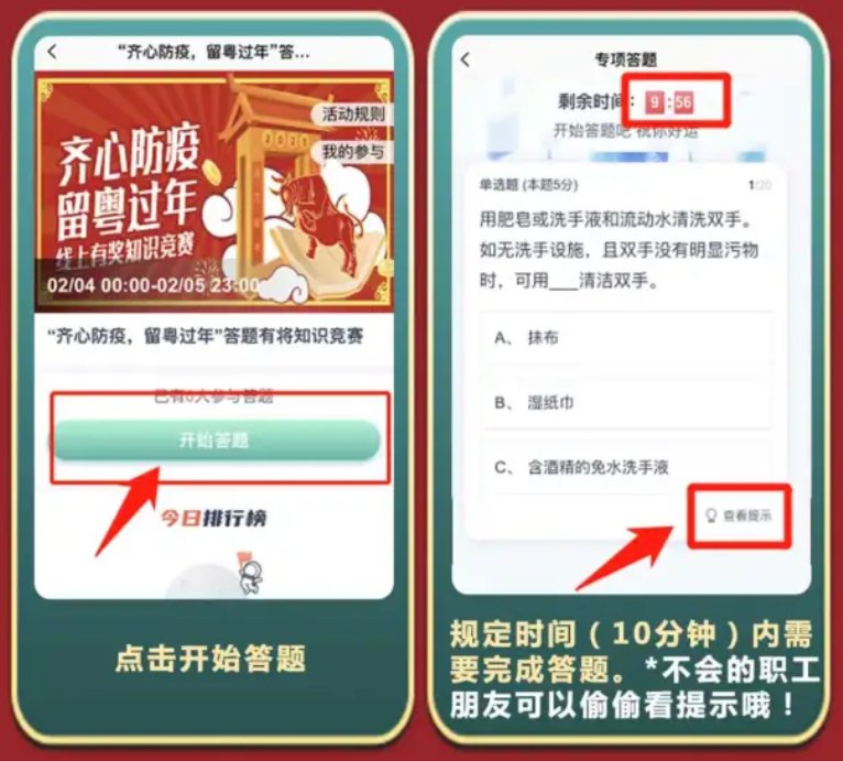 竞赛的题目按“党的十九届五中全会知识学习”“新冠病毒防控知识类”“留粤过年福利政策类”等内容随机出题。