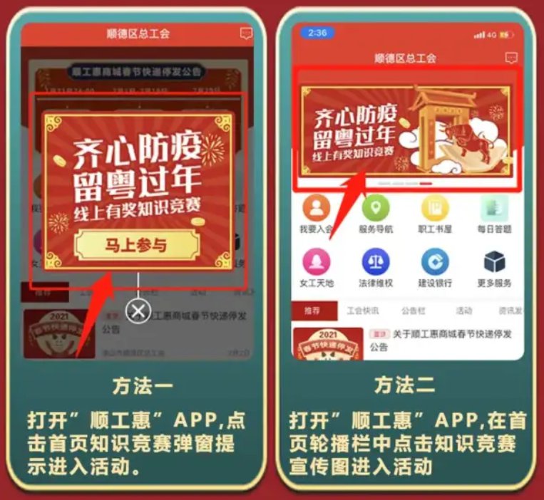 第一步 打开“顺工会”APP,点击首页知识竞赛弹窗提示,或者在首页轮播栏中点击知识竞赛宣传图进入活动。