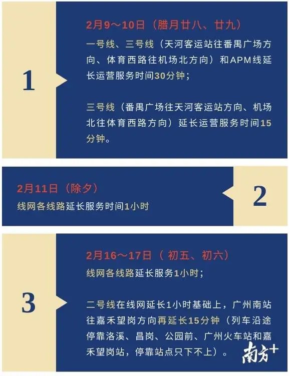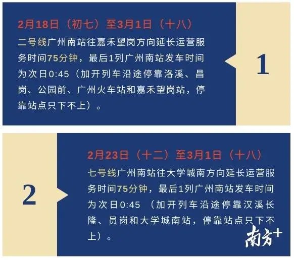 ➤2月16~17日(年初五、初六)二号线在线网延长1小时基础上,广州南站往嘉禾望岗方向再延长运营服务15分钟(列车沿途停靠洛溪、昌岗、公园前、广州火车站和嘉禾望岗站,停靠站点只下不上)。
