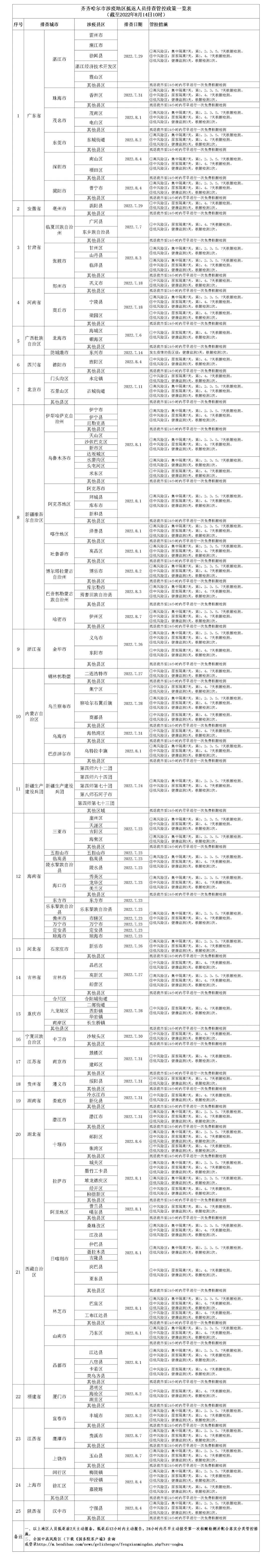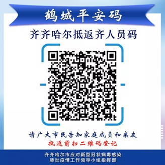 凡近期在市域外有意向抵返齐齐哈尔市人员,抵返前2天主动报备,在进入齐齐哈尔市市域前,要使用手机扫描“齐齐哈尔抵返齐人员码”,点击进入程序后,按照注册内容要求,如实完整填写相关信息;《齐齐哈尔市涉疫地区抵返人员排查管控政策一览表》每日更新,涉及人员抵返后12小时内主动报告,24小时内尽早主动接受第一次核酸检测并配合落实分类管控措施。