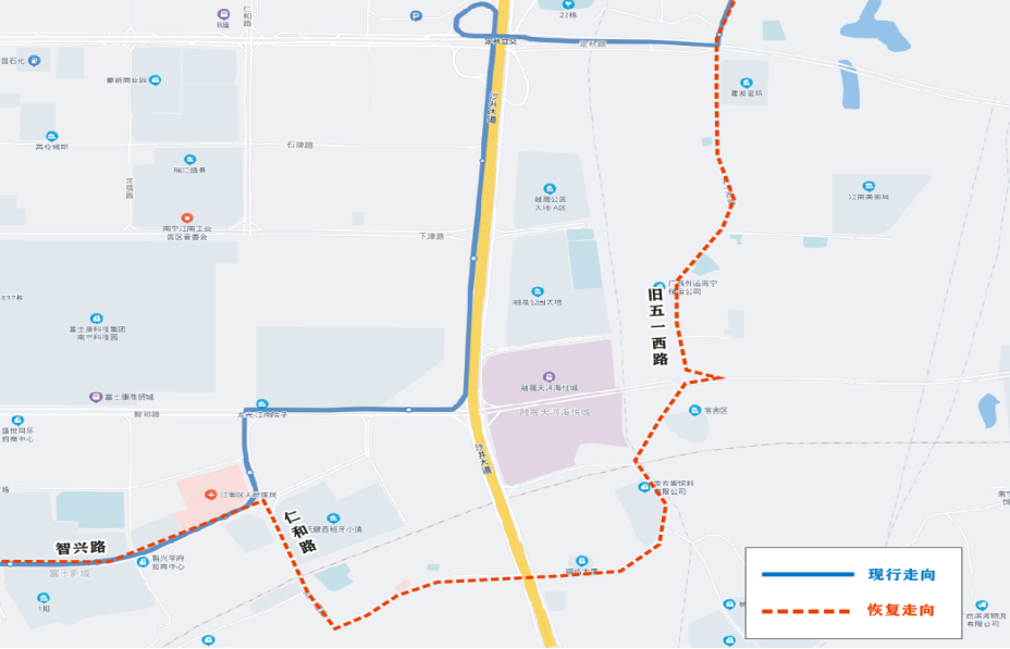 经现场踏勘,亭洪路延长线(规划一路—规划四路)工程项目实施临时限制交通措施已解除,亭洪路与旧五一西路交叉路口已恢复通行,符合公交车安全通行条件。为此,经研究决定,南宁邕城公交公司从2022年8月20日起,恢复210路走向,具体如下: