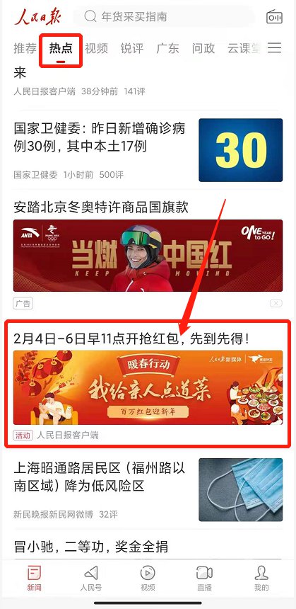 2、2月4日-2月6日,每天早11点打开人民日报客户端,在“热点”频道找到红包开抢提示,点击进入。
