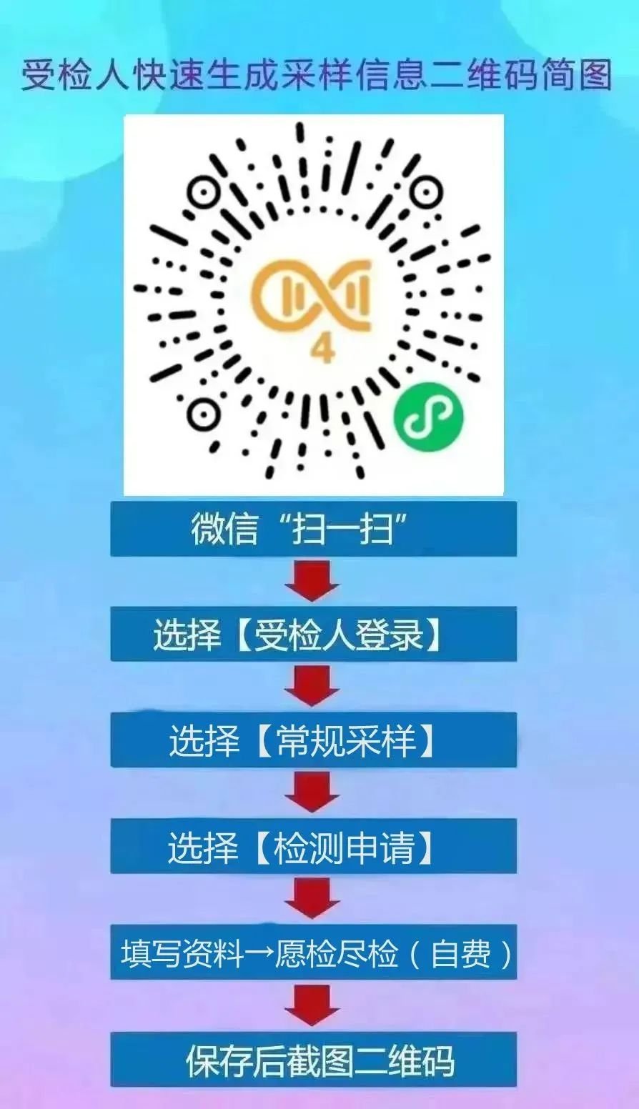 为提高检测效率,请提前在家录入信息,并截图保存二维码(之前已申请的依然有效),到采样点后直接向工作人员展示二维码截图,减少等候。现场检测带上有效身份证件供核验。