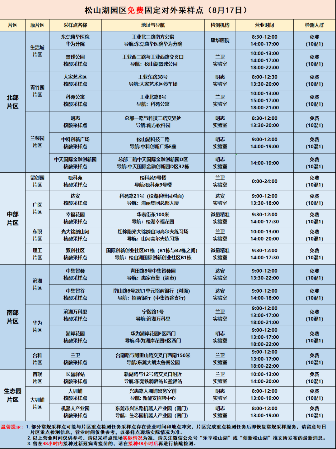 8月17日,松山湖园区于北部、中部、南部开展区域核酸检测,同时四大片区内共设置20个对外采样点进行免费检测,其中理工片区的双创社区核酸采样点明天(8月17日)将会迁移至国际创新创业社区B1栋(B1栋与B2栋之间),启用地点时间如下图表。
