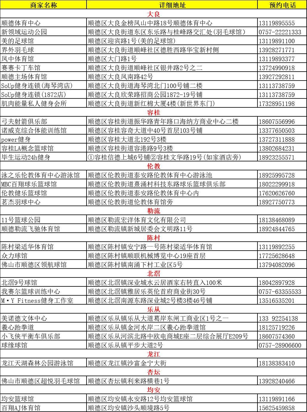 | 顺德体育中心 | 顺德区大良金榜凤山中路18号顺德体育中心 | 13119895555 |