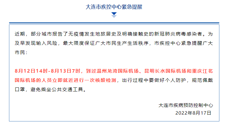 大连疾控提醒近日有温州、昆明、重庆三地机场旅居史人员主动核酸