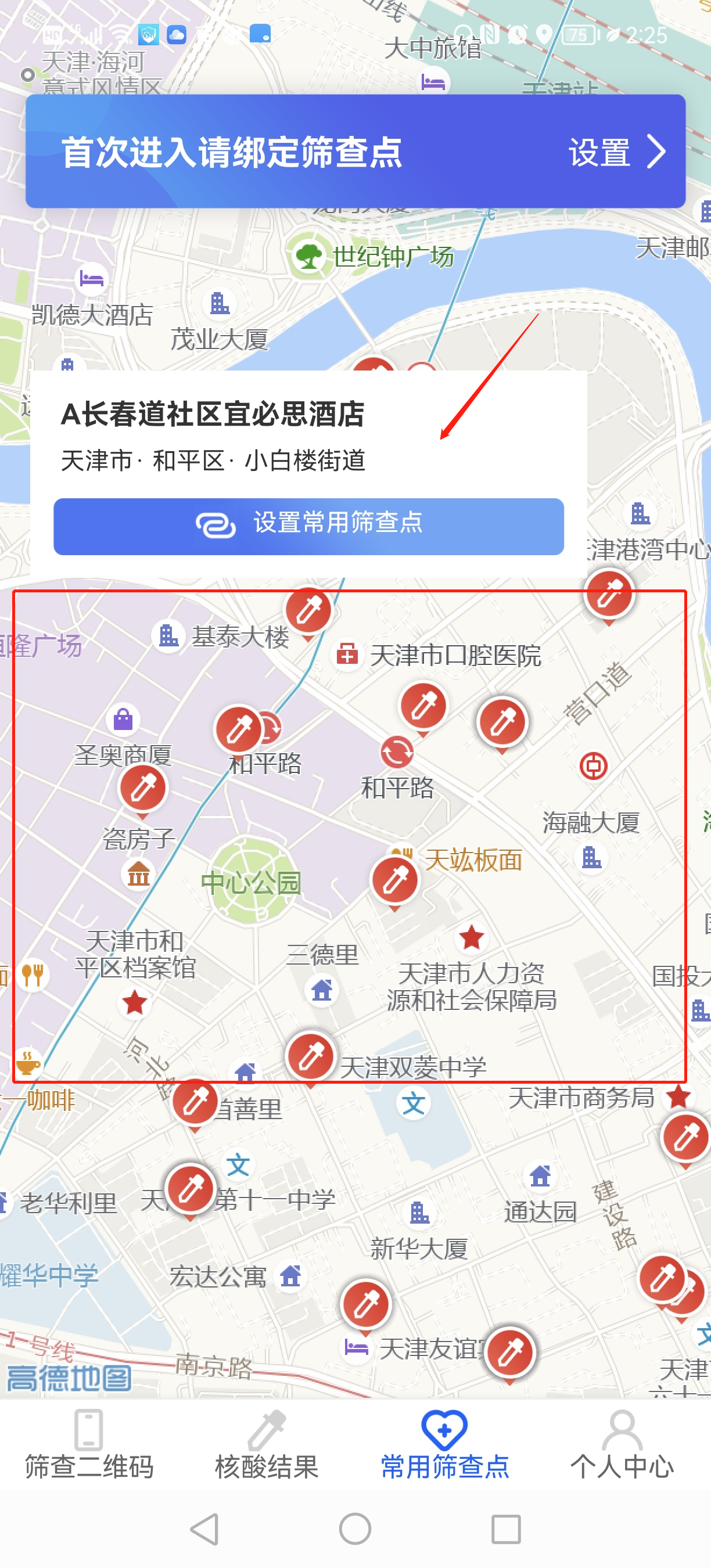 3、进入后,地图直接显示周围筛查点,点击地图中的红色针管图标,即可查看核酸筛查点名称,所属地区街道,点击“设置常用筛查点”即可直接设置为本人常用筛查点。