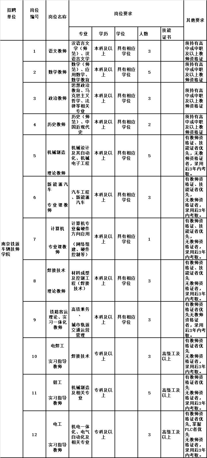 南京铁道车辆技师学院2022年公开招聘教师公告