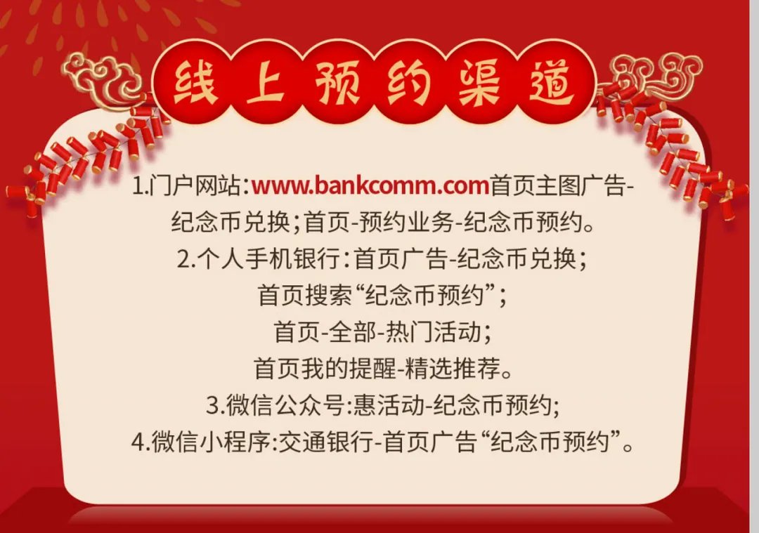 1.门户网站:www.bankcomm.com,首页主图广告-纪念币兑换;首页-预约业务-纪念币预约。