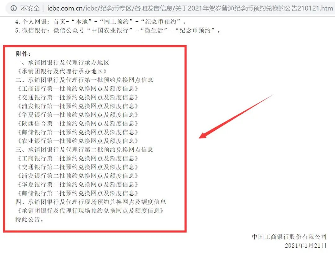 在中国工商银行发布的《关于2021年贺岁普通纪念币预约兑换的公告》中,已经公布了承销团银行及代理行约兑换网点信息。