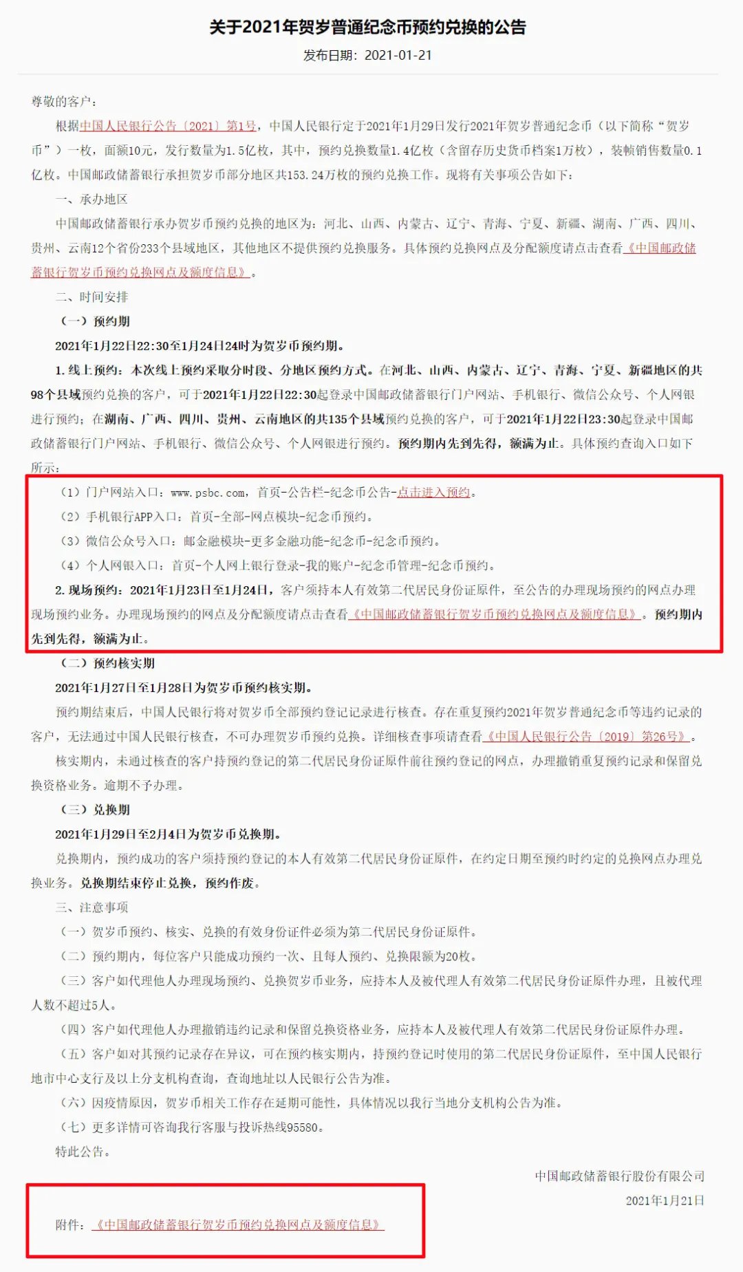 在网站邮储银行网站首页点击公告栏查看《关于2021年贺岁普通纪念币预约兑换的公告》