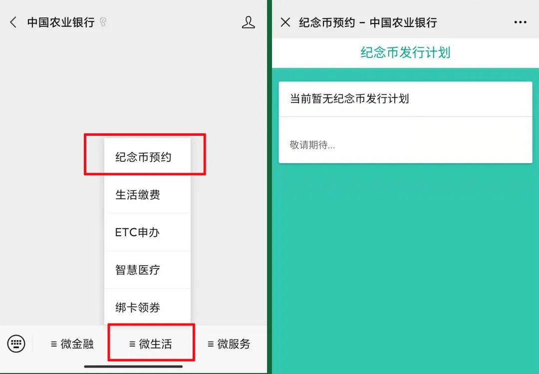 4.微信公众号:“中国农业银行”-“微生活”-“纪念币预约”