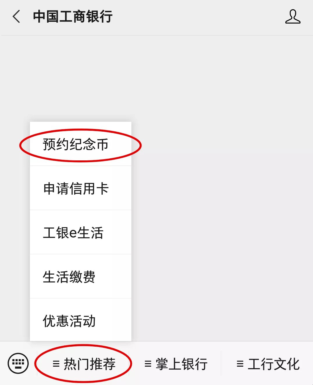 6.微信公众号:“中国工商银行”微信公众号,点击下方菜单“热门推荐-预约纪念币”,按提示操作即可。