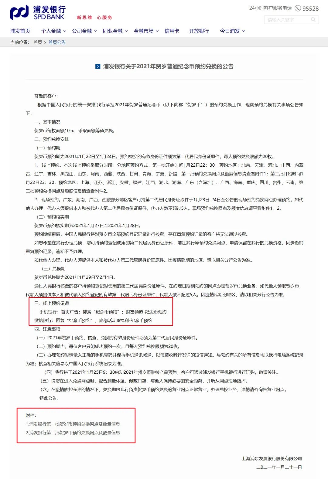 登陆浦发银行官网,首页公告中可以查看《浦发银行关于2021年贺岁普通纪念币预约兑换的公告》。