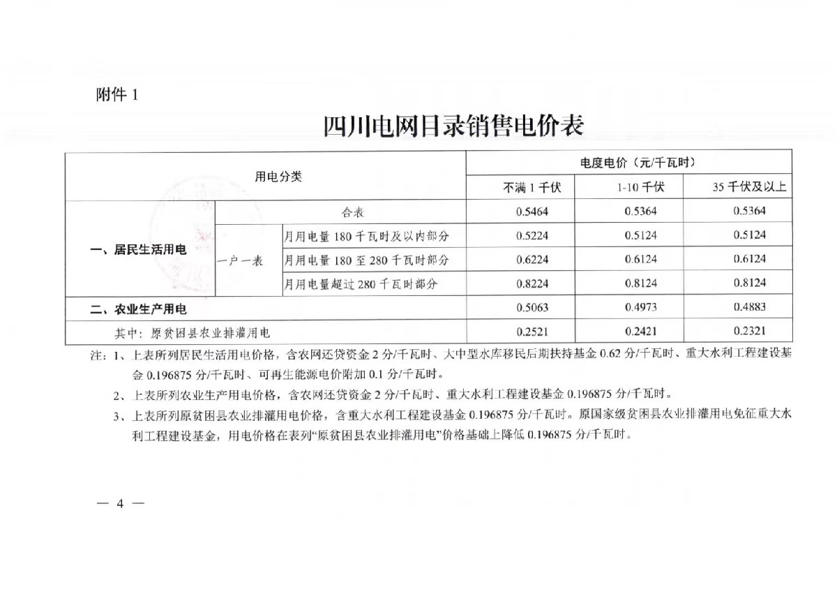 一、全面取消国网四川电网工商业目录销售电价,仅保留居民生活、农业生产目录销售电价,调整后的国网四川电网目录销售电价表见附件1,各增量配电网参照执行。国网四川电网供区内未同价地区,居民生活、农业生产用电暂按现行目录电价执行。省属地方电网、其他地方电网目录销售电价另文明确。优先将低价电源用于保障居民生活、农业生产用电。