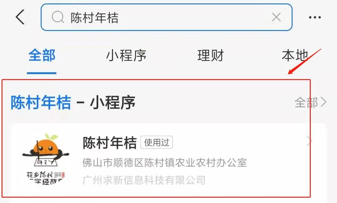 第二步:输入“陈村年桔”,点击搜索结果;