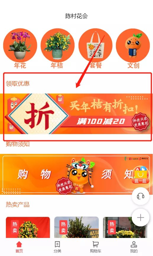 本次活动升级上线云赏陈村花会线上商城,提前预售“国字号”精品年桔,逢周一和周五线上商城将会发放“满300减100”“满100减30”的优惠券。只需一键,精品年桔就从田间送到到你家。