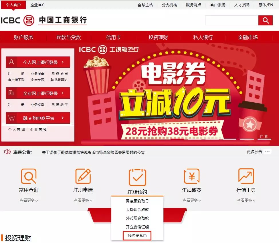 2、官网“在线预约”的菜单中有“纪念币预约”,点击进入即可找到预约通道。